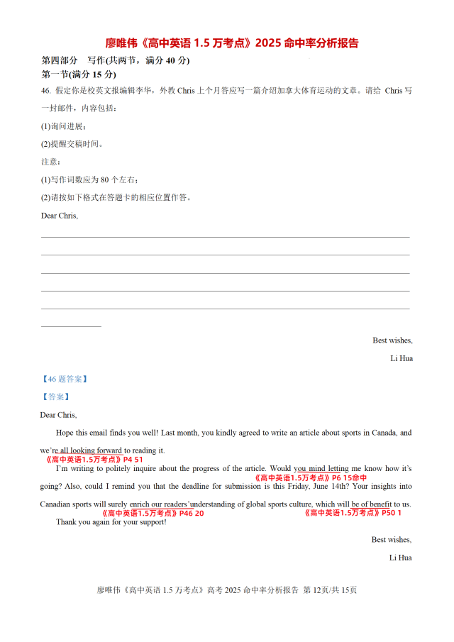 25年新高考全国2卷书面表达考的是一篇催稿函,这个体裁以前没考过,但是文章本身难度不大,范文用了四个考点来提亮文章,在我的72页词组短语笔记“廖唯伟英语1.5万考点”里全部覆盖了。