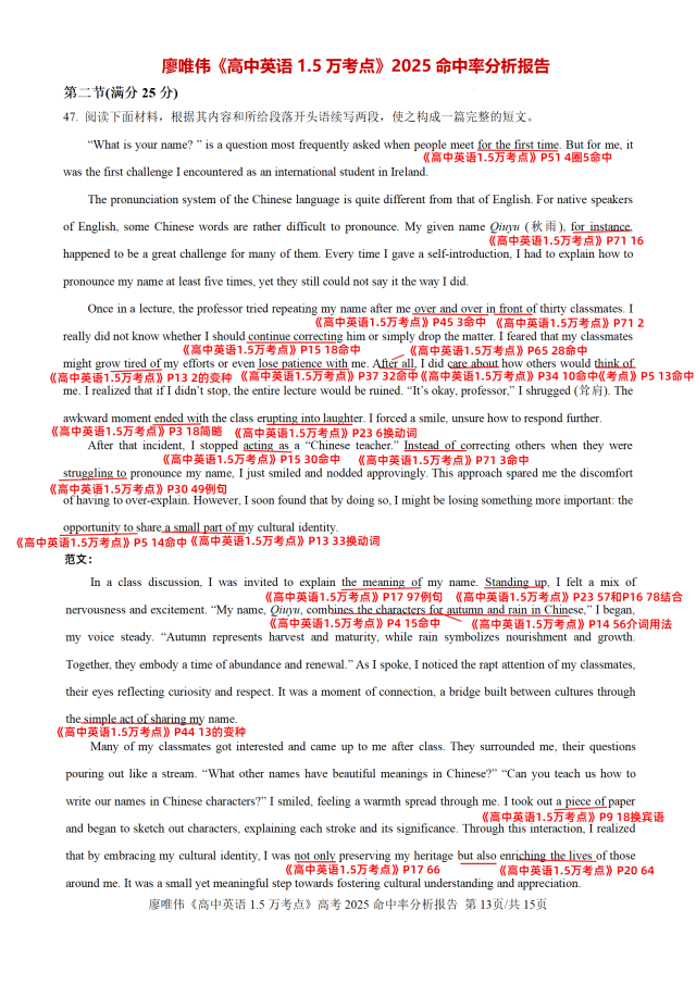 25年新高考全国2卷读后续写考的也是一个涉及中国元素的文章,讲的是一个留学国外的中国学生关于自己名字的故事,这种文章作为续写内容,开放性比较大,但是前文有暗示,要注重中国文化的传播,要有转折和积极的结果,这是很多考生容易忽视的。全文一共考了25个词组短语和固定用法,“廖唯伟英语1.5万考点”全部覆盖到了。