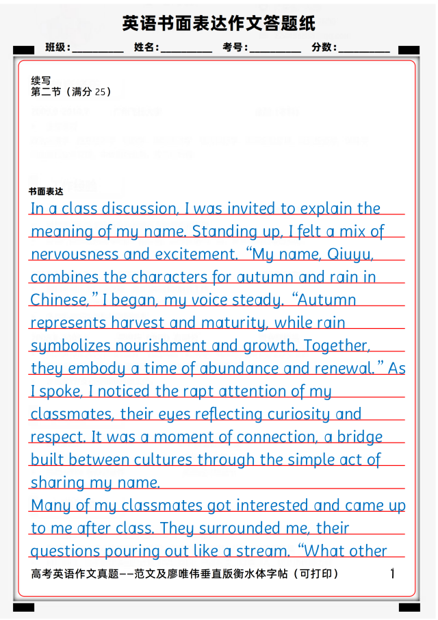 在一次课堂讨论中,我受邀解释我名字的含义。站起来时,我感到既紧张又兴奋。“我的名字,秋雨,在中文里结合了‘秋’和‘雨’两个字,”我开口道,声音平稳。“秋天代表着收获与成熟,而雨象征着滋养与生长。两者结合在一起,寓意着一个丰盈与新生的时节。”当我讲述时,我注意到同学们全神贯注,眼中闪烁着好奇与尊重。那一刻,通过分享自己名字这个简单的举动,我们之间建立起了连接,一座跨越文化的桥梁得以构建。